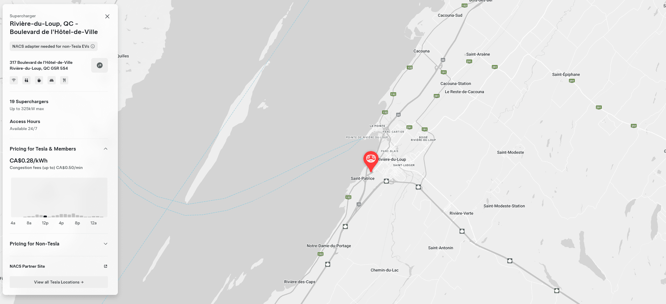 Located at 311–317 Boulevard de l’Hôtel-de-Ville, this site features 20 V4 Supercharger stalls, each capable of delivering up to 325 kW. The station is open to all EVs, supporting NACS and CCS (with adapter) and offers charging for as low as CA$0.28/kWh. The site opened to the public in December 2025.